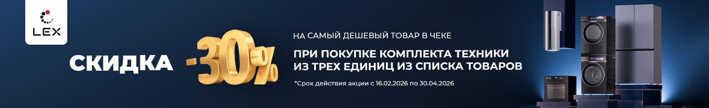 С 16.02.2026 по 30.04.2026 при покупке комплекта техники из 3х единиц предоставляется дополнительная скидка 30% на наименьший по стоимости товар. Товары в комплекте должны быть из разных категорий.