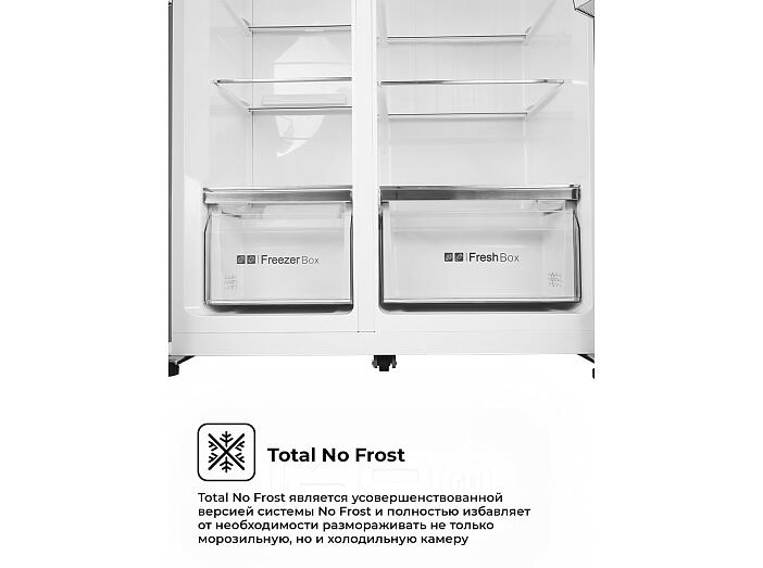 суперзаморозка и быстрое охлаждение, а также смарт-режим и поддержание температуры в течение нескольких часов, которое пригодится при неполадках с электричеством. Благодаря расположению дверей SIDE BY SIDE продукты в обеих камерах можно размещать на комфортных для вас уровнях. Технология Total No Frost делает уход за холодильником максимально легким, чтобы у вас было больше свободного времени, а мощный инверторный компрессор работает почти бесшумно.