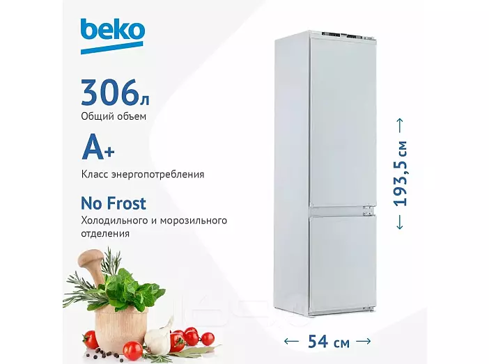Встраиваемый холодильник Beko BCNA306E2S создан для тех, кто ценит функциональность и хочет получать удовольствие от каждого взаимодействия с техникой. Благодаря технологии Total No Frost (тотал ноу фрост) вам не придется часто размораживать холодильник, а специальная синяя подсветка в ящике для фруктов и овощей будет продлевать процесс фотосинтеза в продуктах, сохраняя свежесть, вкус и полезные свойства. Зона с температурой 0-3˚C подойдет для качественного хранения мяса, рыбы и свежих молочных продуктов, а хромированная полка для бутылок освободит пространство и поможет комфортно разместить продукты в холодильнике.Модель Beko BCNA306E2S — это сочетание практичности, современных технологий и продуманного дизайна. Электронное управление, яркая подсветка, режим ""Отпуск"" и энергоэффективность класса A+ делают использование этого холодильника удобным, приятным и экономичным.Далее