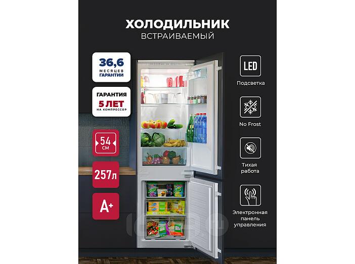 DeFrost — в холодильной камере, NoFrost — в морозильной. Такая инновация позволяет экономить электроэнергию. Холодильник имеет электронное управление, комфортную LED-подсветку. Габариты для встраивания указаны в технических характеристиках. Дверь модели может быть установлена как слева, так и справа.