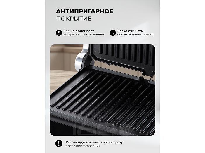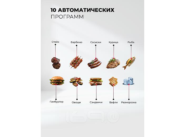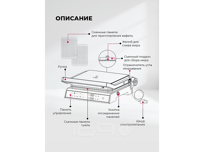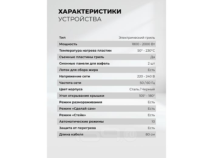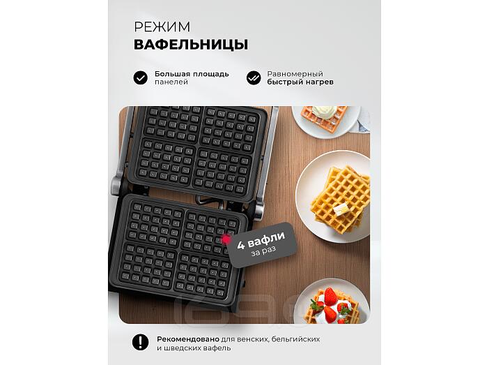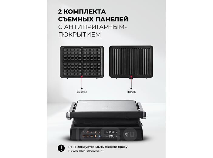 Гриль быстро и равномерно нагревается, обеспечивает нужную температуру приготовления для превосходной корочки снаружи и сочности внутри. Модель имеет 10 автоматических программ, в том числе для приготовления вафель. Сменные панели для них входят в комплект.