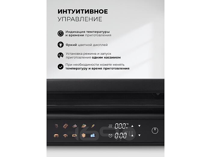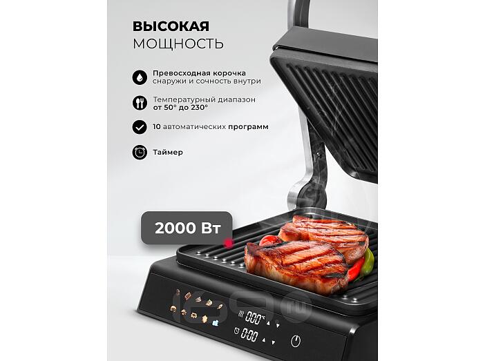 Максимальная мощность гриля — 2000 Вт, температуру можно выбрать в диапазоне от 50 до 230 °C. Это дает возможность точной настройки под любой рецепт. Вы можете изменить время и температуру приготовления в любом режиме.