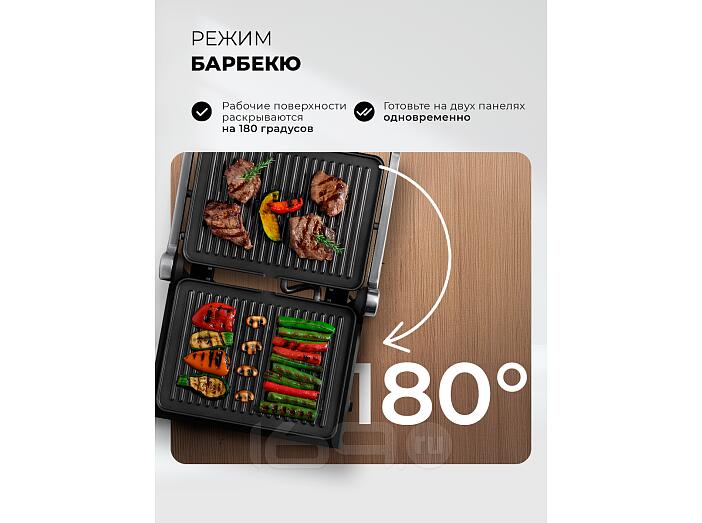 Рабочие поверхности раскрываются на 180 градусов, что позволяет приготовить блюда в режиме «Барбекю» на двух панелях одновременно. На гриле можно поджарить мясо и овощи, а также приготовить аппетитные вафли на десерт.