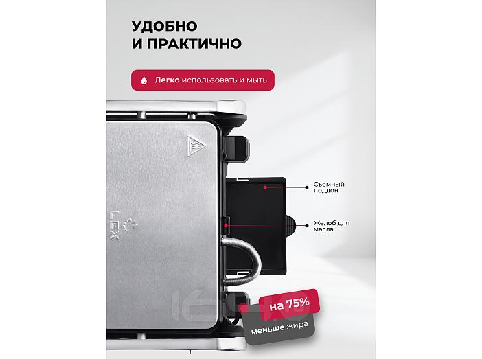 они стекают по специальному желобу в поддон. За устройством просто ухаживать: съемный поддон и антипригарные сменные панели легко очищать после использования.
