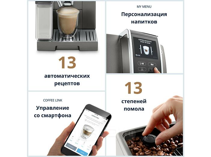Особенности:Индикация очистки от накипи, Функция My Menu, Одновременное приготовление двух чашек, Функция LatteCrema System, Индикатор отсутствия кофе, Управление с телефона, Регулировка порции воды, Регулировка плотности пены, Регулировка крепости кофе, Регулировка диспенсера по высоте, Подогрев для чашек