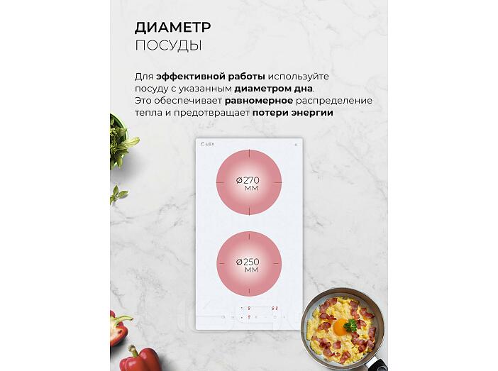Компактная электрическая индукционная варочная панель LEX EVI 320A WH имеет 2 конфорки и сенсорное управление. Ширина для встраивания 300 мм. Современный индукционный нагревательный элемент демонстрирует высокую скорость нагрева, существенно экономит электроэнергию и сокращает время приготовления блюд. Стеклокерамическая модель снабжена кнопкой блокировки панели, индикатором остаточного тепла, защитой от перегрева, распознаванием наличия посуды, таймером конфорок. Функция Boost дает возможность кратковременного и сильного повышения мощности конфорки. Незаменимая функция для быстрого закипания жидкостей. Несмотря на общее мнение, что поверхность в индукционной плите не нагревается, это не совсем так. Она нагревается от самой посуды и нужно быть аккуратными. Сразу после снятия кастрюли или сковороды, поверхность горячая, хотя и практически мгновенно остывает. И уже через несколько секунд её можно трогать рукой.