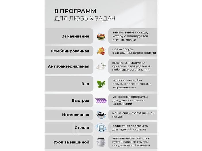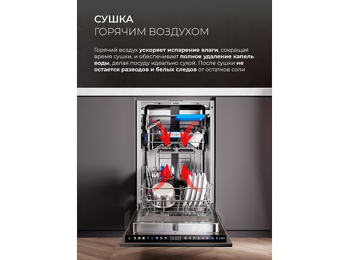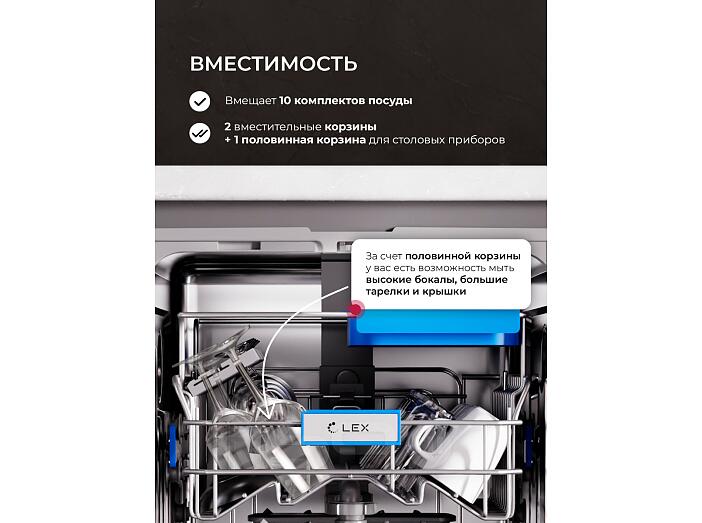 Высокие технологии и стиль для вашего дома!LEX PM 4583B color Lux — это идеальное решение для тех, кто ценит функциональность, удобство и безопасность. Две вместительные корзины и одна половинная корзина для столовых приборов, за счет которой у вас есть возможность мыть высокие бокалы, тарелки и крышки. Полностью сенсорная панель из закаленного стекла с цветными изображениями придает модели современный вид и повышает её надежность.Максимальный комфорт в использованииФункция отложенного старта до 24 часов позволяет запускать посудомоечную машину в любое удобное время. Технология “проекция времени в пол” обеспечивает полный контроль над процессом мойки. Автоматическое открытие дверцы в конце цикла ускоряет сушку и устраняет неприятные запахи.Экономия ресурсов и бесшумная работаLEX PM 4583B color Lux расходует всего 10 литров воды за цикл и соответствует высокому классу энергоэффективности A+++. Уровень шума — всего 49 дБ, что делает её практически незаметной даже в ночное время.Широкий выбор программ для любой посудыВосемь программ, включая быстрый и режим для стекла, позволяют добиться идеальной чистоты даже для деликатных бокалов. Сушка горячим воздухом ускоряем испарение влаги, сокращая время сушки и обеспечивает полное удаление капель воды, делая посуду идеально сухой. После сушки не остается разводов и белых следов от остатков соли.Безопасность на высшем уровнеМногоступенчатая система защиты от протечек Aqua-Stop — обеспечивает максимальный уровень безопасности посудомоечной машины при любых сбоях подачи воды. А обработка ультрафиолетом в конце цикла уничтожает известные вирусы и бактерии на 99%.Основные преимущества:Две вместительные корзины и половинная полка для столовых приборов.Сенсорная цветная панель управления из закаленного стекла.Технология “проекция времени в пол”.Автооткрывание дверцы для удобства.Обработка ультрафиолетом.Отложенный старт на период до 24 часов.Восемь программ, включая быстрый и режим для стекла.Низкий уровень шума — 49 дБ.Экономичное потребление воды — 10 литров за цикл.Класс энергопотребления A+++.Максимальная температура воды — 70 °C.LEX PM 4583B color Lux — это сочетание стиля, надежности и инновационных решений, созданное для вашего комфорта!