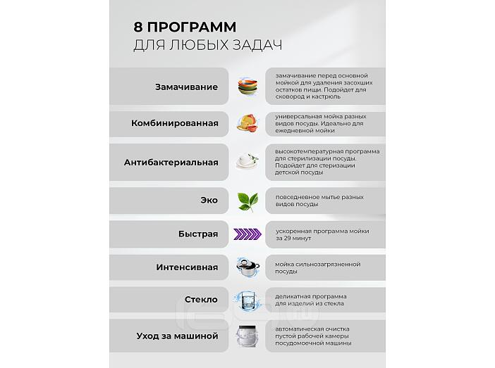 Программы:Эко, Уход за машиной, Стекло, Комбинированная, Интенсивный, Замачивание, Быстрая, Антибактериальная