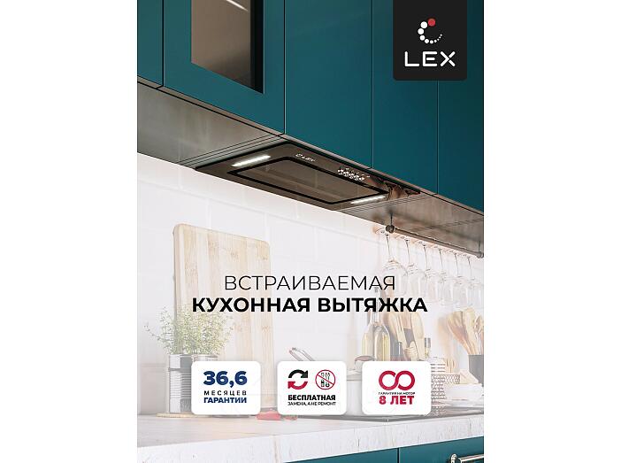 LEX GS BLOC G 600 BLACK – один из лучших вариантов если необходимо спрятать вытяжку, сохранив весь ее функционал. Модель чёрного цвета имеет 3 скорости, кнопочное управление, красивую подсветку LED лампами. Модель шириной 600 мм имеет черный цвет, оснащена периметральной аспирацией (SPA), алюминиевым фильтром, который можно мыть в посудомоечной машине. LEX GS BLOC G 600 BLACK может работать как в режиме отвода воздуха, так и в режиме рециркуляции.