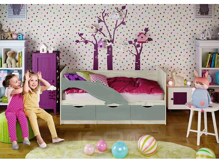 Кровать Дельфин без обивки шарли бриз/дуб крафт белый без подъёмного механизма 800x1600, без ортопедического основания, изголовье жесткое