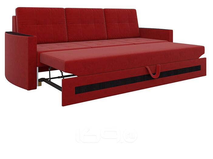 Прямой диван Атлантида со столом выглядит оригинально, при этом функционален в использовании. В считанные минуты, его можно трансформировать в удобную двуспальную кровать с ортопедическим основанием. Его выгодной особенностью являются подлокотники с деревянной столешницей.