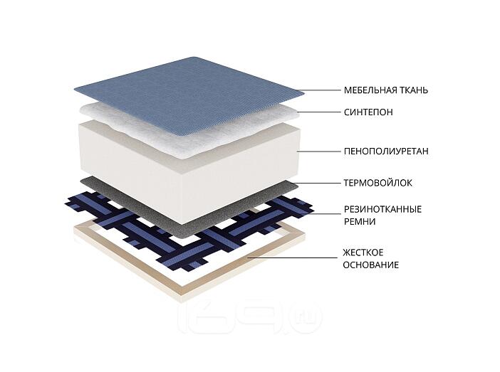 Каркас: ЛДСП. Качественный материал, созданный из натуральной стружки дерева, спрессованной и покрытой защитным ламинированным слоем. Корпус дивана не боится повышенной влаги, выдерживает большие нагрузки, не деформируясь.