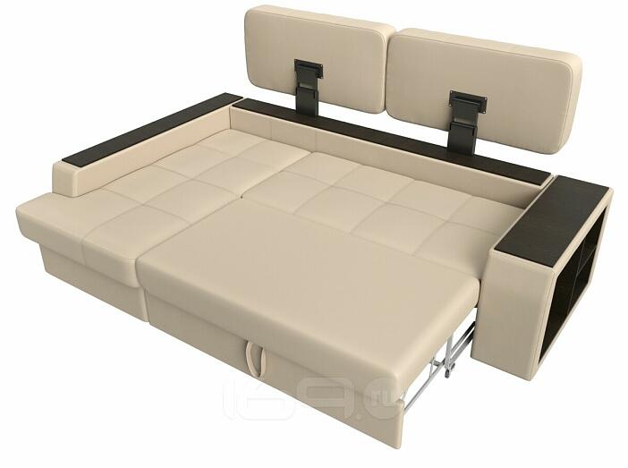 Шикарный угловой диван Брюссель удобен и функционален в использовании. Подлокотники выполняют роль мини-столиков. Одна из боковин дополнена книжными полками, декорированным «под дерево». Под длинной боковиной расположена ниша для белья. Изделие оснащено удобным механизмом трансформации в двуспальную кровать.