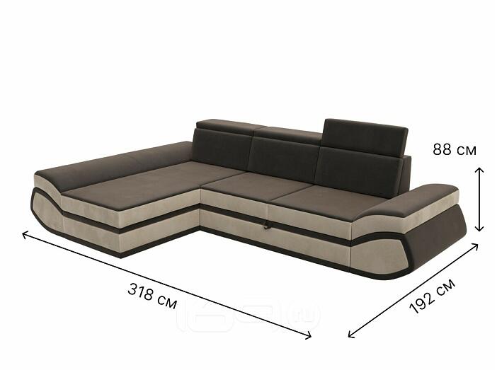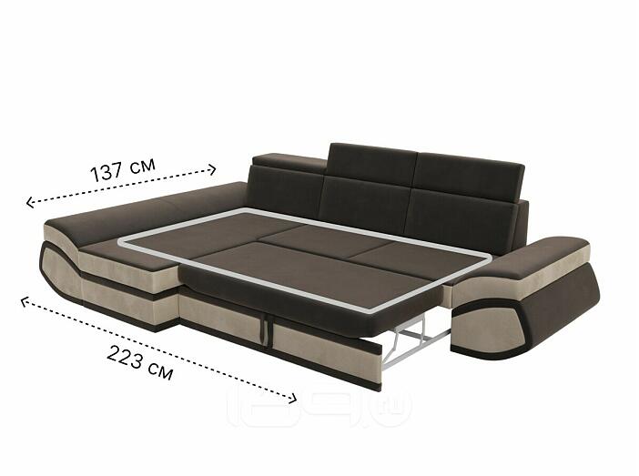 Угловой диван с расположением угла с левой стороны. Внешне напоминает английскую букву L. Механизм трансформации находится в длинной стороне. Модель занимает две стены, можно использовать для зонирования пространства.