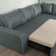 Механизм раскладки: дельфин. Трансформировать угловой диван можно потянув за скрытую под сиденьем петлю. Нижняя часть конструкции выкатится вперед по направляющим. Спальный блок поднимается из открывшейся ниши на кронштейнах.