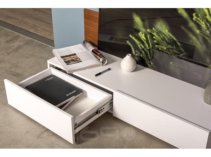 Выдвижные ящики на шариковых направляющих. В навесных шкафах фасады открываются за край.