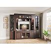 Гостиная может быть составлена из большого количества различных комбинаций. Основой композиции может являться высокая центральная группа с карнизом и подсветкой, которые создают торжественный и статусный образ, а декоративные фьюзинги на стекле витрин добавляют ему деликатности и утончённости. Центральная группа может быть дополнена шкафной группой, набранной согласно желанию клиента - все модули прекрасно сочетаются и стыкуются друг с другом. Логичным завершением любой компоновки может служить универсальный торцевой модуль - витрина.
