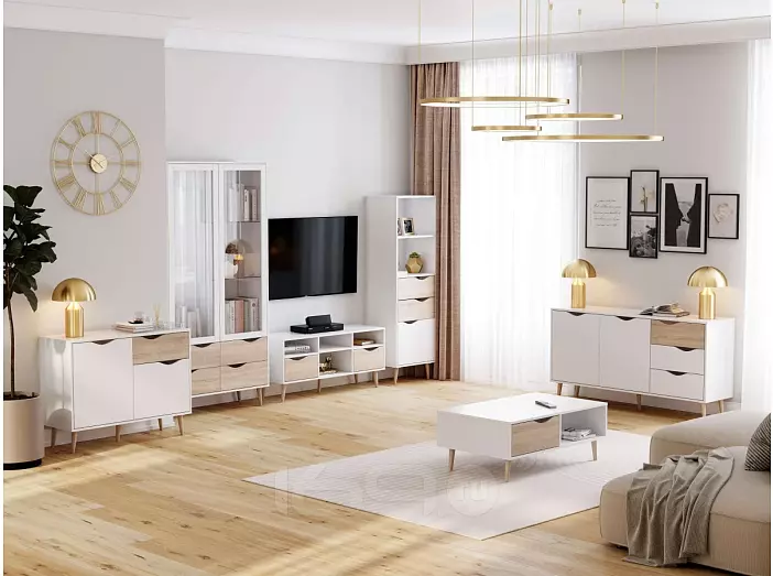 Серия «Соната» отличается простотой и натуральностью, выполнена в естественных тонах. В дизайне отчетливо улавливаются отсылки к скандинавской эстетике: чистые линии корпуса, использование белого цвета в отделке фасадов, расставленные в стороны высокие стильные опоры, выполненные из массива березы.
