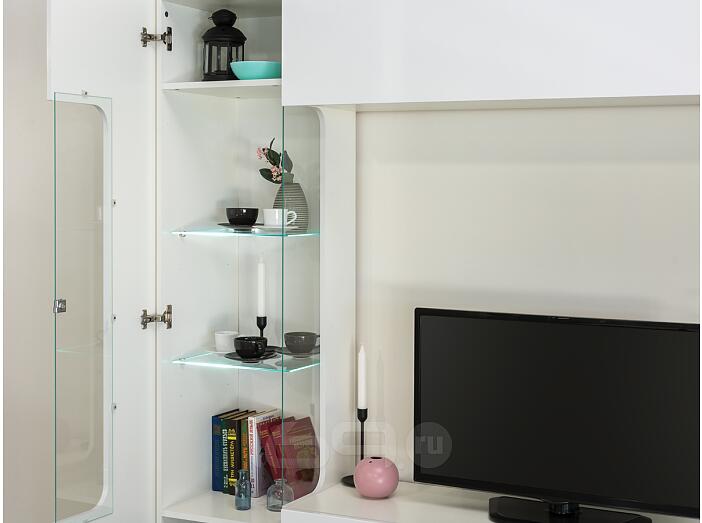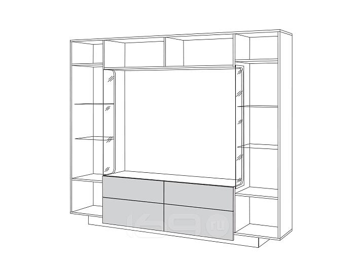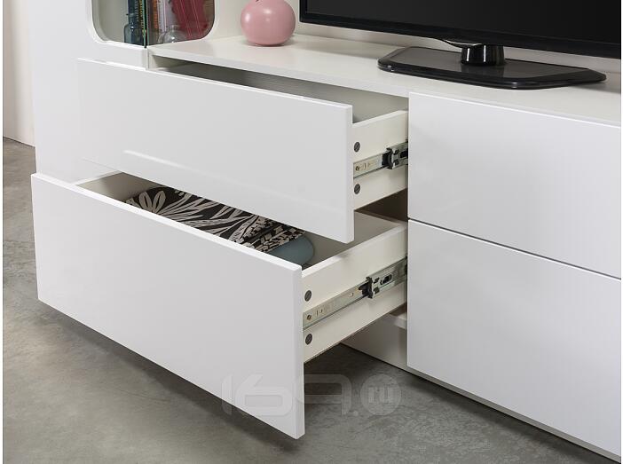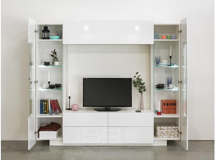 Функциональная гостиная, здесь достаточно места для вещей, которые хочется показать и которые хочется скрыть. Подсветка в угловых витринах спокойна и не навязчива, но создает космическую атмосферу. А выдвижные ящики оснащены направляющими полного выдвижения с встроенной системой Push to open.