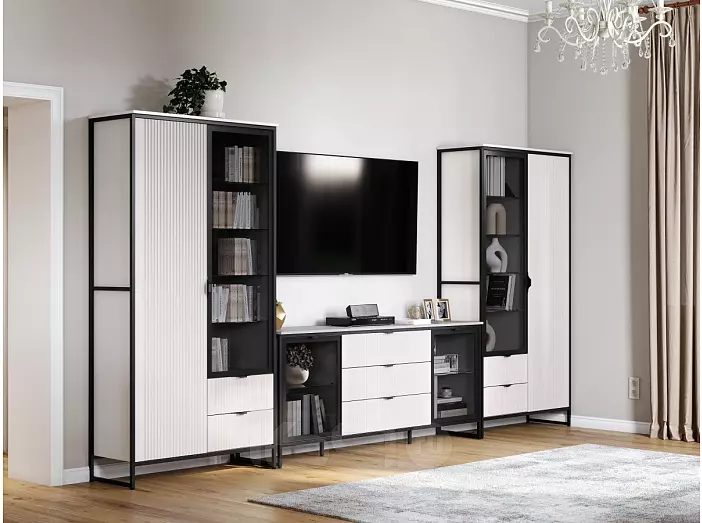 Коллекцию модульной гостиной "Нора" отличает современный оригинальный стиль. Декоративная продольная фрезеровка на фасадах из МДФ и опоры на металлокаркасе цвета соответствуют модным тенденциям этого года в ведущих зарубежных коллекциях.