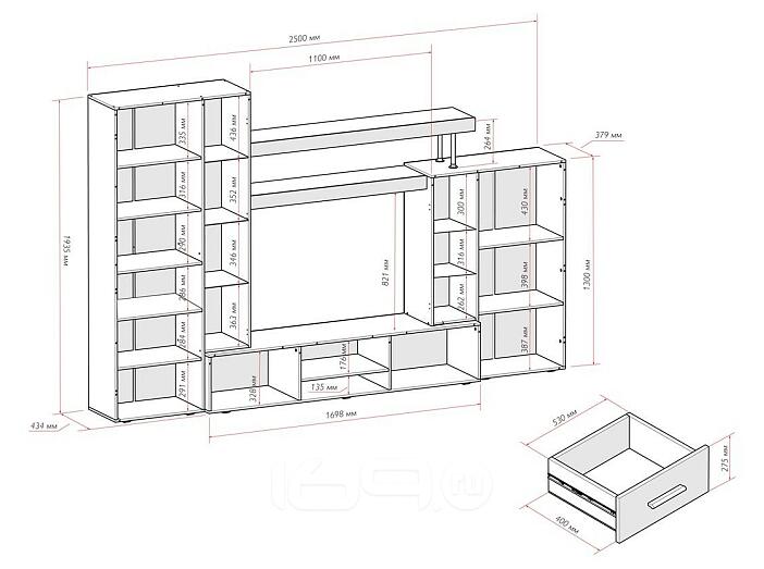 Общие габариты:Высота 193,5 см, ширина 250 см, глубина 43,4 см