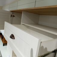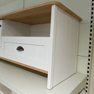 Корпус модульной системы изготовлен из 16 мм ламинированой древесностружечной плиты «Дуб Небраска» и 16 мм древесностружечной плиты, укрытой финиш-ппленкой «Сосна Белая». Торцевые поверхности корпуса закромлены кромками ABS и ПВХ. Рамочные фасады изготовлены из МДФ профиля и укутаны финиш-пленкой «Сосна Белая».
