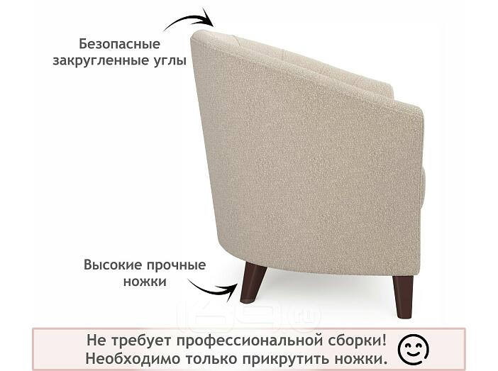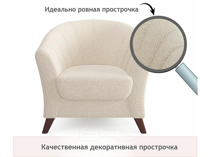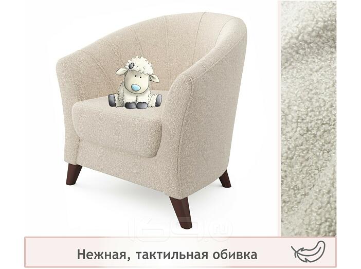 Мягкое интерьерное кресло может быть выполнено в различных цветовых вариантах из высокопрочного модного материала – букле (мягкий барашек). Это очень мягкая и приятная на ощупь ткань. Ткань износостойкая, легко чиститься от загрязнений, практичная, эластичная, устойчивая к ультрафиолету.