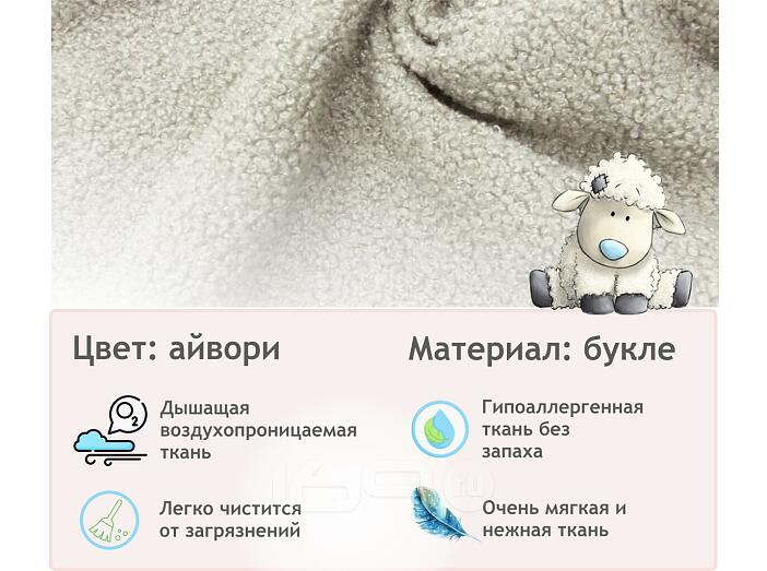 Экран мобильных устройств и монитора компьютера не всегда могут корректно на 100% передать цвет окончательного изделия. Мебельная ткань “букле” (барашек) очень часто играет при свете – меняя оттенок от темного до более светлого. Поэтому возможны незначительные цветовые отличия при получении модели.