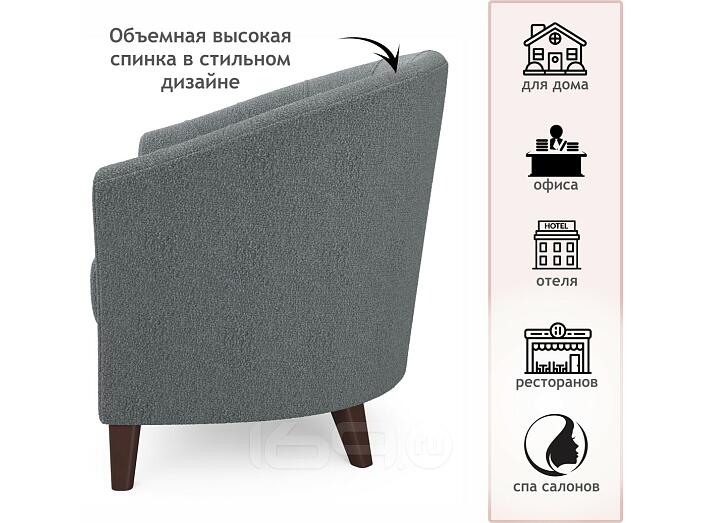 Серое мягкое кресло Line букле прекрасно впишется в интерьер спальни, гостиной, детской, офисного помещения, загородного дома. А также может быть стильным креслом для кафе и ресторана.