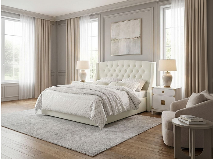 Основной акцент сделан на высоком изголовье с мягкими боковинами – “ушками”. Мягкая спинка изящно оформлены каретной стяжкой с декоративными пуговицами в тон изголовья. Мягкие боковины не только придают королевский вид данной двуспальной кровати, но и позволяют использовать ее для отдыха. Обивка изголовья и весь периметр кровати выполнен из мебельной ткани – велюр. Это уникальный материал, который получается за счет сплетения пяти волокон одновременно. Дорогая ткань велюр придает кровати более величественный благородный вид. Ткань износостойкая, легко чиститься от загрязнений (влажной тряпочкой, любыми средствами, кроме средств с растворителями), практичная, эластичная, устойчивая к ультрафиолету. Задняя стенка обшита спанбондом. Кровать оборудована удобным подъемным механизмом. Подъемный механизм с гнутоклееными ортопедическими основаниями поднимает кровать под углом 45 градусов. Безопасное противоударное скругление в ножной спинке является весьма актуальным и взрослым и детям. 10 летняя гарантия на металлическую рамку. Газлифты повышенной мощности позволяют поднимать и опускать ортопедическую рамку с матрасом без всяких усилий. Передняя часть предназначена для хранения постельных принадлежностей. Данное пространство закрывается противопыльным матерчатым коробом из плотного спанбонда. Матерчатый короб фиксируется в подматрасном пространстве с помощью системы ленты-липучки ""HOOK&LOOP"".