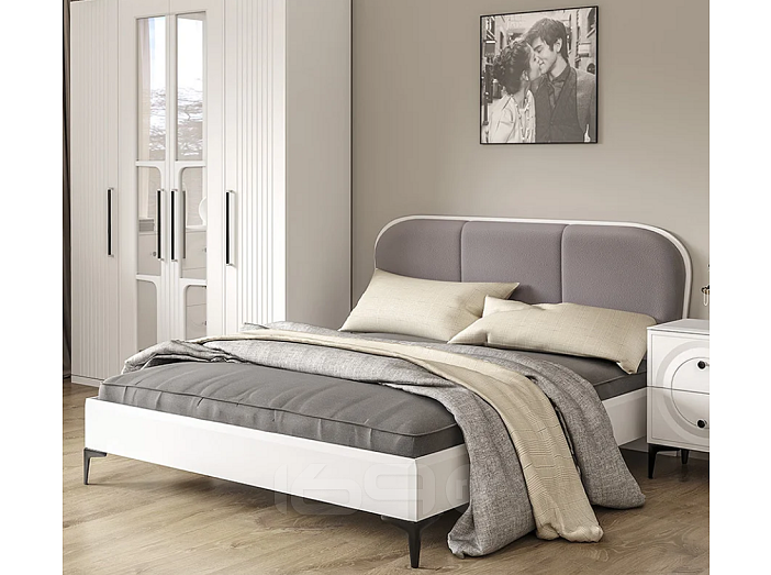 Кровать установлена на высокие ножки, что делает конструкцию лёгкой и воздушной, изголовье кровати декорировано пышным мягким элементом. Матрас укладывается на ортопедическое основание с гнутоклееными ламелями.