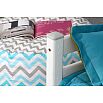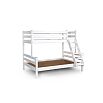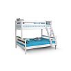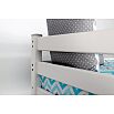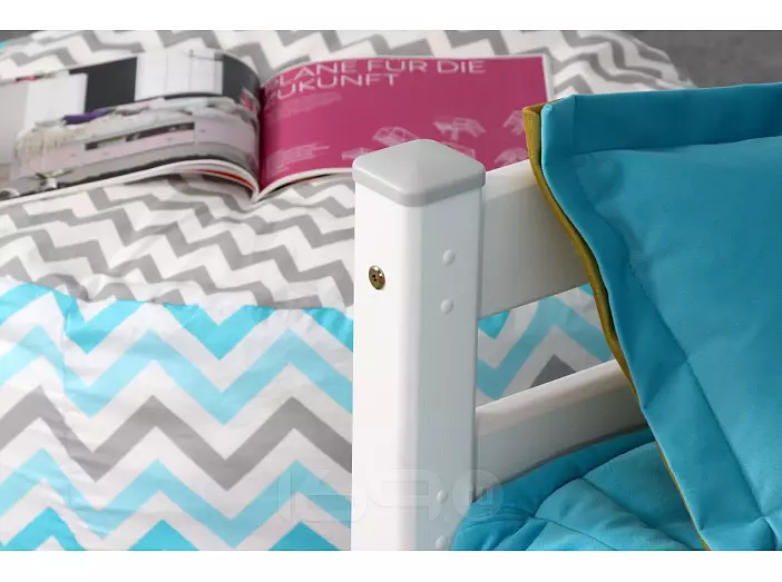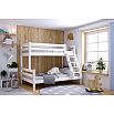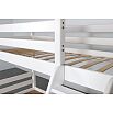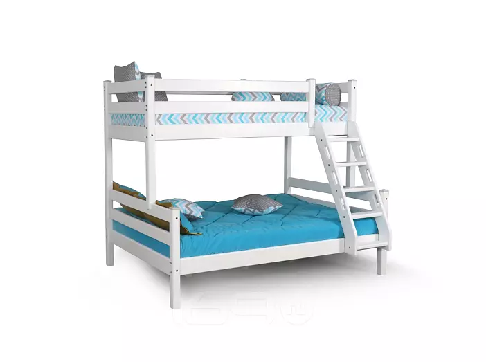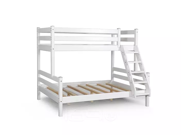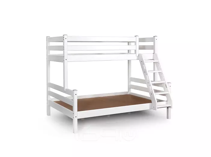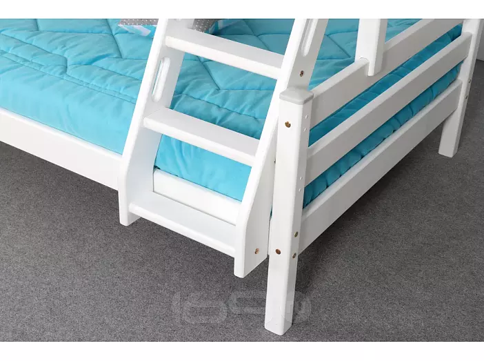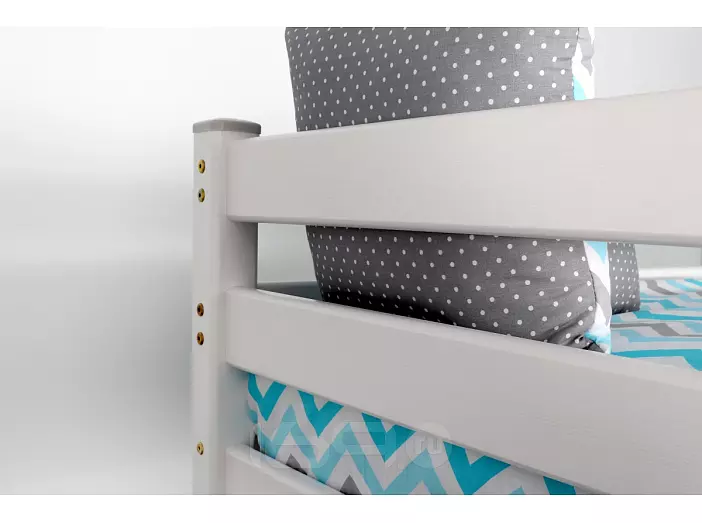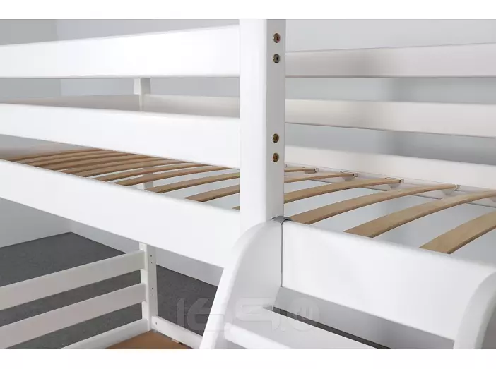 Увеличенное до 120 см по ширине спальное место нижнего яруса подходит для подростка, чей вес не превышает 70 кг. Верхнее основание имеет вид гнутых ламелей, с усиливающей перемычкой по периметру, нижнее представлено опорными брусками с уложенным поверх них настилом из шлифованного МДФ 10мм. Массив сосны подвергнут тщательной шлифовке и покрыт безопасным лаком на водной основе.