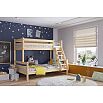 Увеличенное до 120 см по ширине спальное место нижнего яруса подходит для подростка, чей вес не превышает 70 кг. Верхнее основание имеет вид гнутых ламелей, с усиливающей перемычкой по периметру, нижнее представлено опорными брусками с уложенным поверх них настилом из шлифованного МДФ 10мм. Массив сосны подвергнут тщательной шлифовке и покрыт безопасным лаком на водной основе.