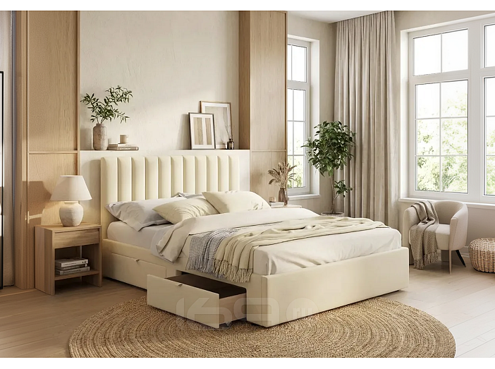 Кровать Olivia велюр бежевый без подъёмного механизма 1600x2000, ортопедическое основание, изголовье мягкое