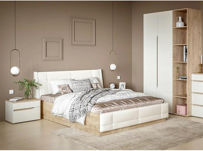 Кровать Муссон искусственная кожа марвел вайт/дуб эндгрейн элегантный/дуб эндгрейн элегантный с подъемным механизмом 1600x2000, изголовье мягкое