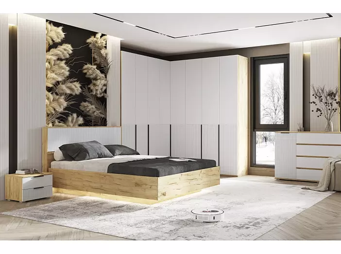 Кровать Марвэл без обивки браш вайт/дуб крафт без подъёмного механизма 1600x2000, изголовье жесткое
