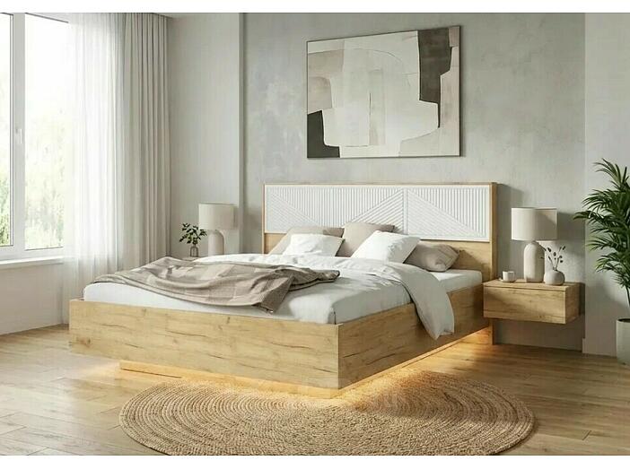 Кровать Сильвия с подсветкой без обивки браш вайт/дуб крафт без П/М 1600x2000, изголовье жесткое