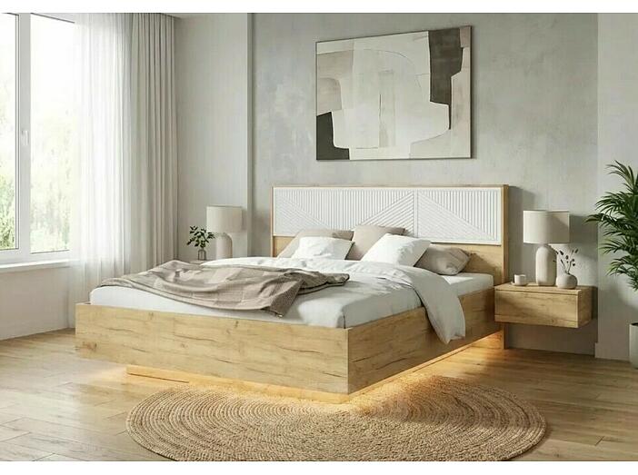Кровать Сильвия с подсветкой без обивки браш вайт/дуб крафт С П/М 1600x2000, изголовье жесткое