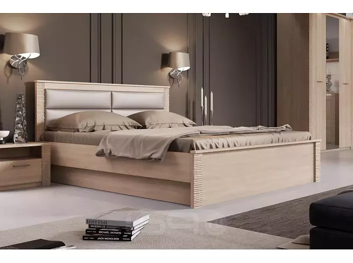 Кровать оснащена мягким изголовьем, состоящим из четырёх элементов, обтянутых экокожей.