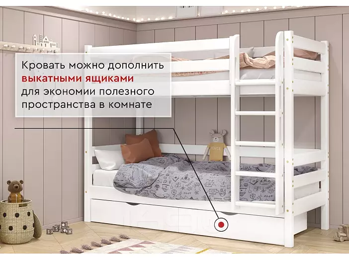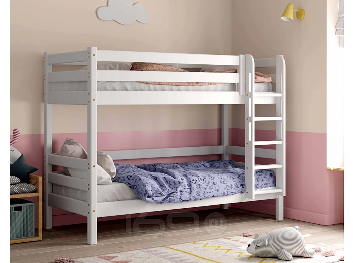 Двухъярусная кровать Авалон из соснового массива – практичное решение для организации пространства небольшой детской комнаты в современном стиле. Все элементы изделия скруглены, поэтому дети не будут травмироваться, используя мебель. К кровати, расположенной на верхнем ярусе, ведет удобная и безопасная прямая лестница с широкими ступенями. Она защищена высокими бортиками, чтобы ребенок не упал во сне на пол.