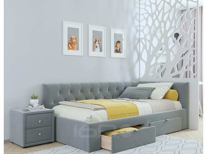 Угловая кровать-тахта Afelia (Афелия) 900 с двумя мягкими спинками выполнена из модной мебельной ткани – велюр. Это уникальный материал, который получается за счет сплетения пяти волокон одновременно. Ткань износостойкая, легко чиститься от загрязнений, практичная, эластичная, устойчивая к ультрафиолету.