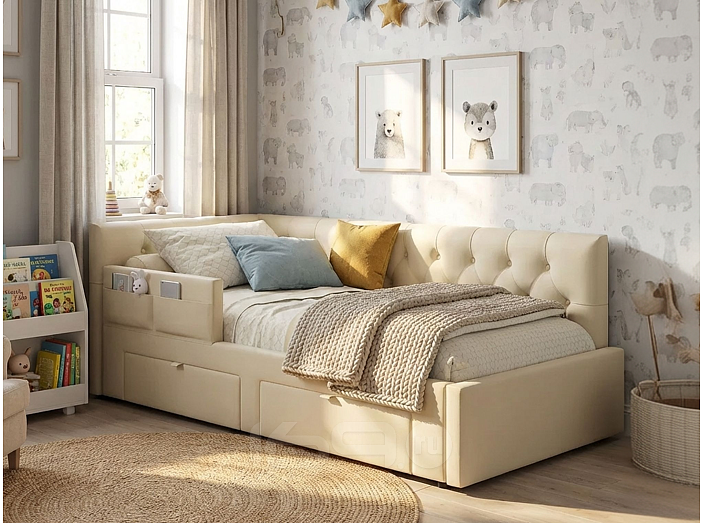 Угловая кровать-тахта Afelia (Афелия) 900 с двумя мягкими спинками и защитным бортиком выполнена из модной мебельной ткани – велюр. Это уникальный материал, который получается за счет сплетения пяти волокон одновременно. Ткань износостойкая, легко чиститься от загрязнений, практичная, эластичная, устойчивая к ультрафиолету.