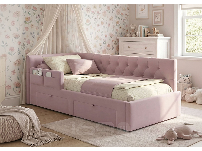 Угловая кровать-тахта Afelia (Афелия) 900 с двумя мягкими спинками и защитным бортиком выполнена из модной мебельной ткани – велюр. Это уникальный материал, который получается за счет сплетения пяти волокон одновременно. Ткань износостойкая, легко чиститься от загрязнений, практичная, эластичная, устойчивая к ультрафиолету.