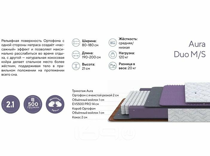 Матрас беспружинный Aura Duo M/S нагрузка до 120 кг 1400x2000
