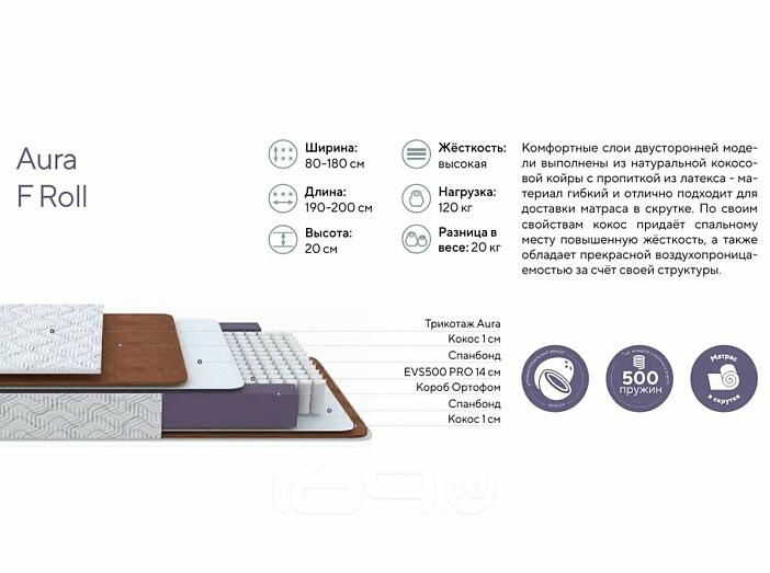 Матрас беспружинный Aura F Roll нагрузка до 120 кг 1600x2000
