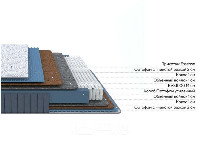 Состав:EVS1000 14 см, Кокос 1 см, Короб усиленный (ВППУ), Объёмный войлок 1 см, Ортофом (ППУ) с ячеистой резкой 2 см