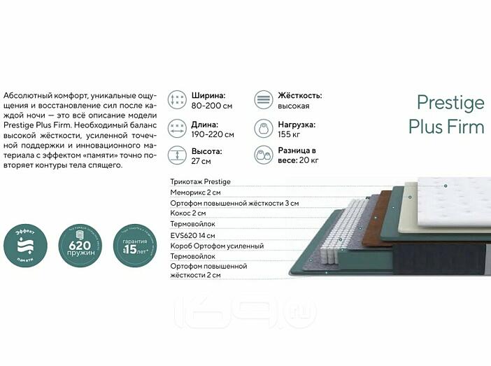 Абсолютный комфорт, уникальные ощущения и восстановление сил после каждой ночи — это всё описание модели Prestige Plus Firm. Необходимый баланс высокой жёсткости, усиленной точечной поддержки и инновационного материала с эффектом "памяти" точно повторяет контуры тела спящего. Стильный и такстильный трикотаж чехол повышенной комфортности в сочетании с роскошным мебельным бурлетом придаёт изделию премиальный внешний вид.