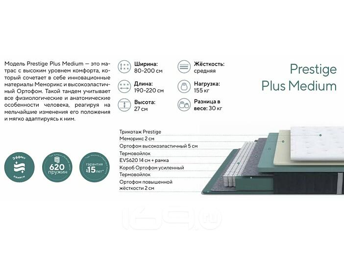 Модель Prestige Plus Medium — это матрас с высоким уровнем комфорта, который сочетает в себе инновационные материалы Меморикс и высокоэластичный Ортофом. Такой тандем учитывает все физиологические и анатомические особенности человека, реагируя на мельчайшие изменения его положения и мягко адаптируясь к ним.