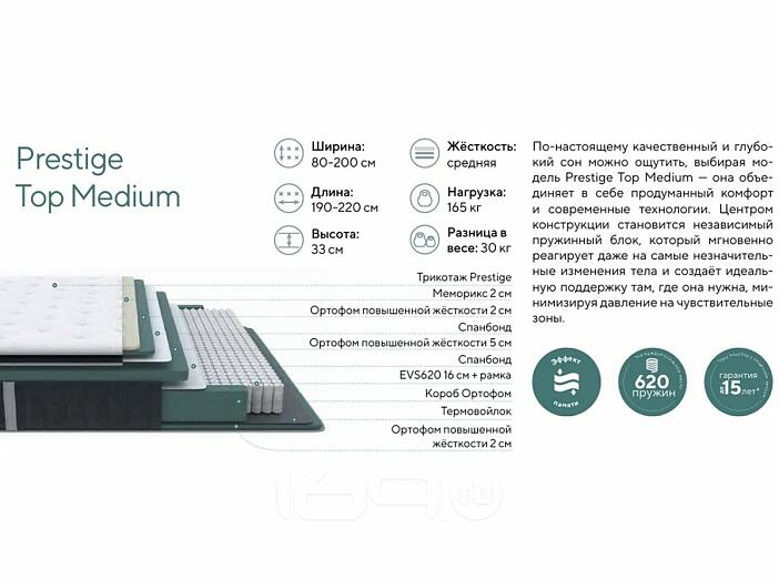 По-настоящему качественный и глубокий сон можно ощутить, выбирая модель Prestige Top Medium — она объединяет в себе продуманный комфорт и современные технологии. Центром конструкции становится независимый пружинный блок, который мгновенно реагирует даже на самые незначительные изменения тела и создаёт идеальную поддержку там, где она нужна, минимизируя давление на чувствительные зоны.
