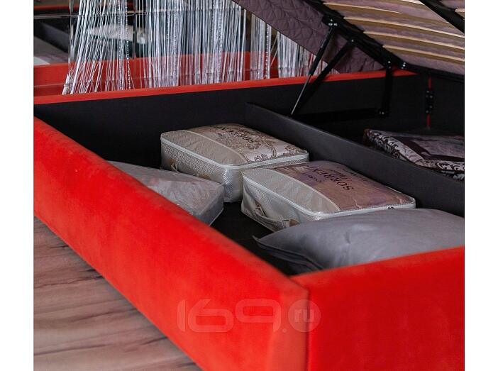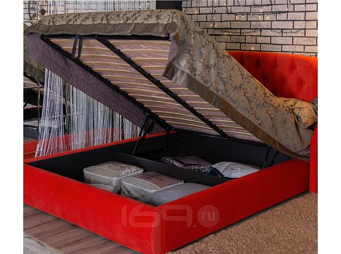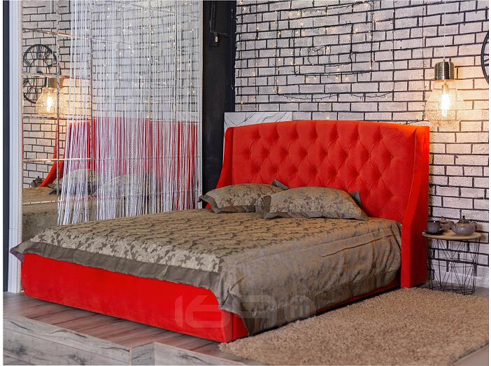 Основной акцент сделан на высоком изголовье с мягкими боковинами – “ушками”. Мягкая спинка изящно оформлены каретной стяжкой с декоративными пуговицами в тон изголовья. Мягкие боковины не только придают королевский вид данной двуспальной кровати, но и позволяют использовать ее для отдыха. Обивка изголовья и весь периметр кровати выполнен из мебельной ткани – велюр. Это уникальный материал, который получается за счет сплетения пяти волокон одновременно. Дорогая ткань велюр придает кровати более величественный благородный вид. Ткань износостойкая, легко чиститься от загрязнений (влажной тряпочкой, любыми средствами, кроме средств с растворителями), практичная, эластичная, устойчивая к ультрафиолету. Задняя стенка обшита спанбондом. Кровать оборудована удобным подъемным механизмом. Подъемный механизм с гнутоклееными ортопедическими основаниями поднимает кровать под углом 45 градусов. Безопасное противоударное скругление в ножной спинке является весьма актуальным и взрослым и детям. 10 летняя гарантия на металлическую рамку. Газлифты повышенной мощности позволяют поднимать и опускать ортопедическую рамку с матрасом без всяких усилий. Передняя часть предназначена для хранения постельных принадлежностей. Данное пространство закрывается противопыльным матерчатым коробом из плотного спанбонда. Матерчатый короб фиксируется в подматрасном пространстве с помощью системы ленты-липучки ""HOOK&LOOP"".